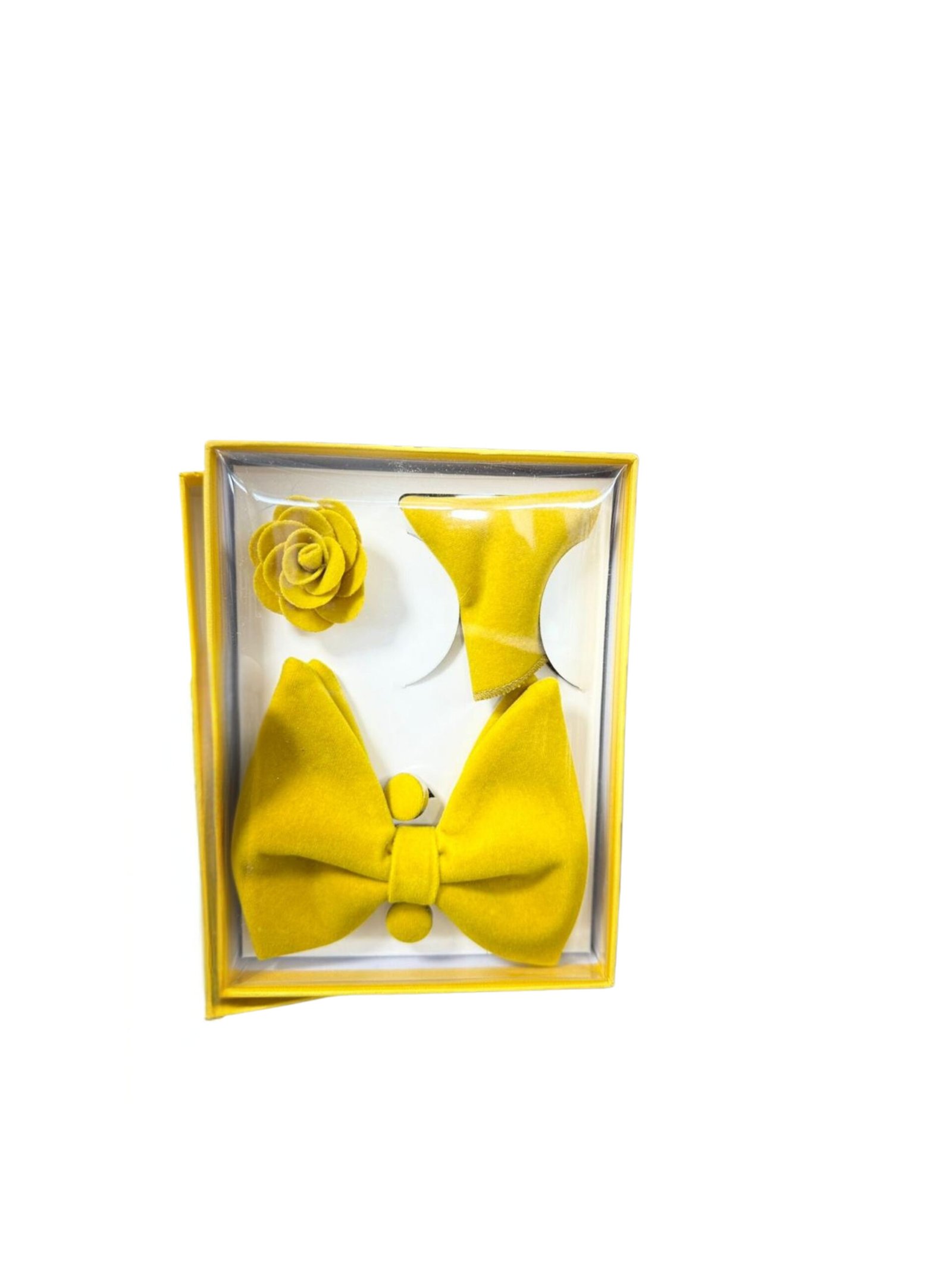 Premium soft velvet with a subtle, elegant sheen. The bow tie is pre-tied for a consistent, perfect shape, and the pocket square features clean-finished edges for various fold styles.